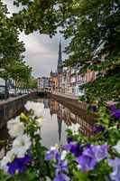 Leeuwarden's Bonifatiuskerk - Een schilderachtige opname van de Bonifatiuskerk in Leeuwarden, gezien vanaf de brug over de Voorstreek (0116). De kerk staat majestueus in de verte, omringd door een prachtig landschap van groene bomen en historische panden langs de gracht.