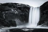 Winter bij waterfall Skógafoss, met een lange belichting in zwart-wit.