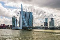 De Rotterdamse skyline op zijn best. De hoge gebouwen langs de Maas en met de Erasmusbrug op de voorgrond maken dit plaatje tot een spektakel stuk.