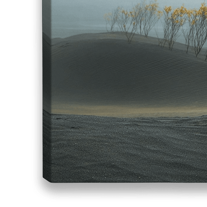 "De Spiegel van Gouden Brem" is een contemplatieve fine art print die fotografie en bijna-surrealistische stilte samenbrengt. De compositie plaatst een perfect ronde, reflecterende bol op zacht geschuurde duinzand; in de bol en op de achtergrond weerspiegelen en omlijsten ranke struiken met warme, goudgele bloesems de nevelige horizon.