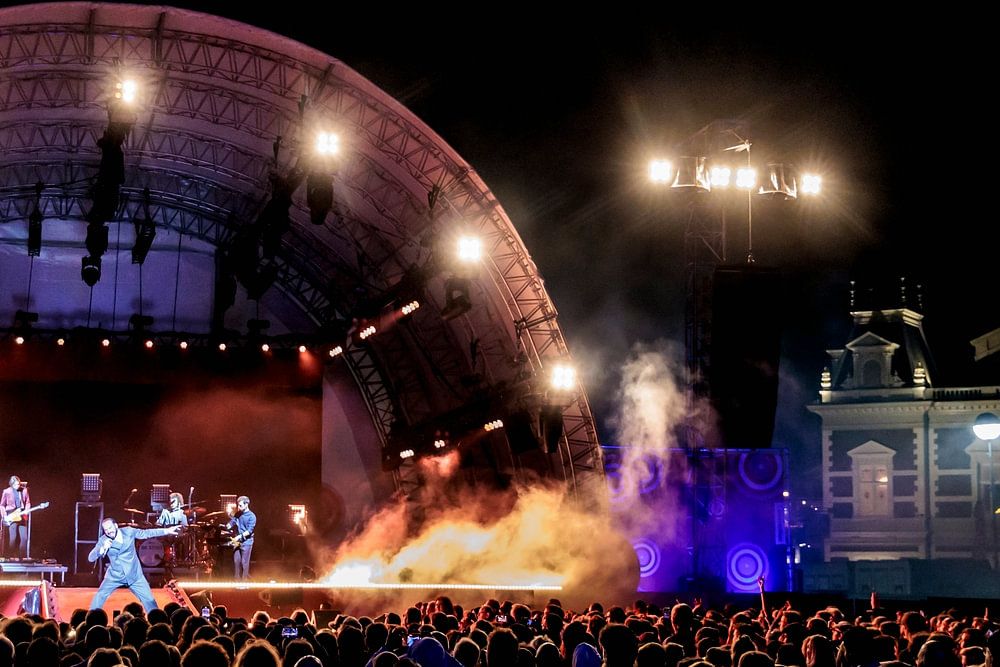 Concert van de Nederlandse band De Staat tijdens de Uitmarkt op het Museumplein in Amsterdam. Op de achtergrond is nog het Concertgebouw zichtbaar.
