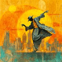 Hij danst alsof niemand kijkt — en alsof de hele stad meekijkt. Een figuur in een wapperende jas en hoed, volledig in beweging, silhouet tegen een brandende zon en een skyline in turkoois en goud. Dit werk heeft ritme. Je voelt het bijna.