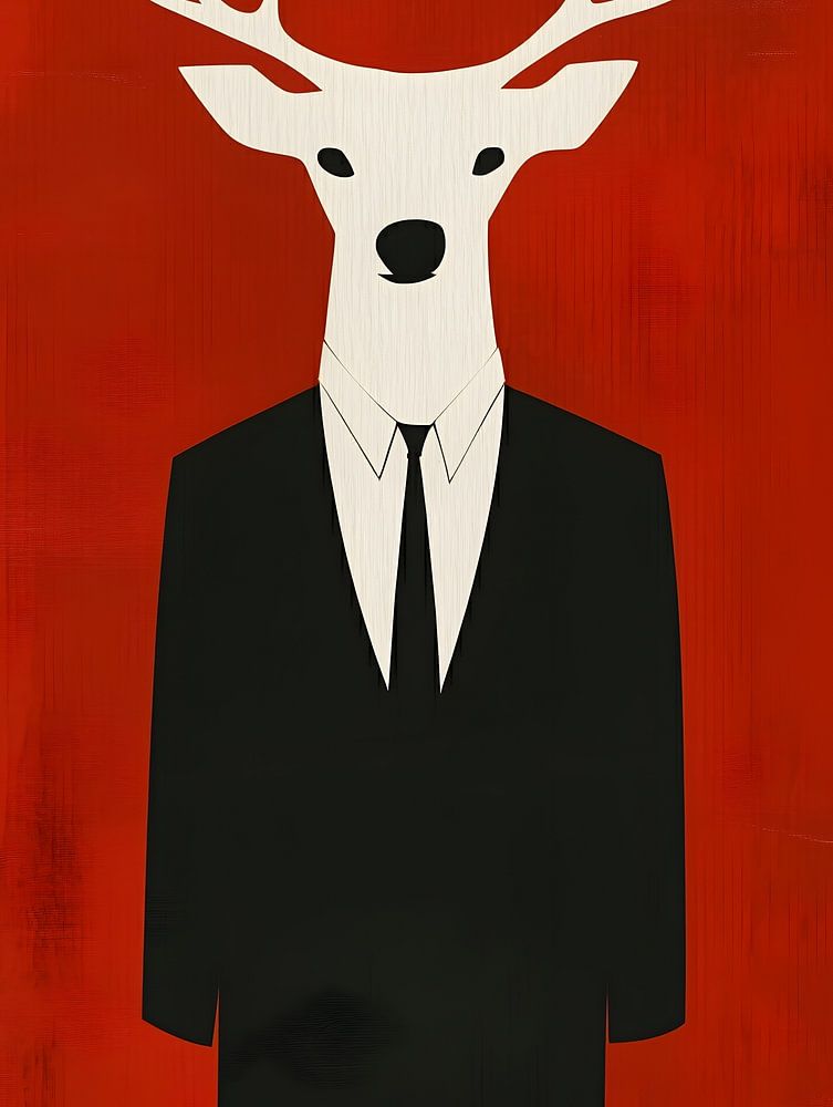 The Stag at Dusk is een opvallend kunstwerk dat het natuurlijke met het surrealistische laat samensmelten. Het stelt een hert voor met een menselijk lichaam gekleed in een formeel pak, tegen een levendige rode achtergrond die een ondergaande zon of een diepe, vurige lucht suggereert. Dit kunstwerk combineert elementen van de traditionele weergave van wilde dieren met abstracte en existentiële thema's, waardoor een krachtige visuele metafoor ontstaat voor de vermenging van de oernatuur van de mens en zijn gecultiveerde persoonlijkheid. Het gedurfde rode kleurenpalet roept een gevoel van passie en intensiteit op, waardoor dit schilderij een ideaal statementstuk is voor verfijnde ruimtes die gedurfde concepten en kunstwerken die een gesprek op gang brengen waarderen, zoals hedendaagse kantoren, eclectische woonkamers of avant-gardistische galeries.