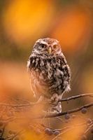 De Steenuil zo klein en schattig kunnen fotograferen in herfst sferen door te spelen met bladeren.