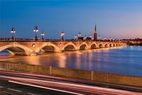 Frankrijk, Aquitaine, Gironde, Bordeaux, De stenen brug vanaf de rechteroever op het blauwe uur