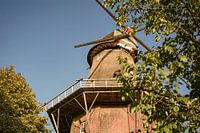 De Stift-windmolen in Aurich in Ostfriesland met het gebladerte van een boom in de voorgrond