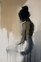 De penseelvoering is los en intuïtief, met vloeiende overgangen tussen licht en donker. De tinten — beige, wit, grijs en diep zwart — lijken te ademen, als lagen van gevoel die over elkaar heen liggen. De contouren vervagen, alsof de grens tussen lichaam en achtergrond niet meer bestaat. Wat resteert, is een kwetsbare aanwezigheid: een mens die even ophoudt met bewegen om te zijn.