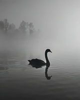 Het wateroppervlak is glad en weerspiegelt de silhouet van de zwaan, wat een gevoel van symmetrie en harmonie creëert. De dikke mist omhult de omgeving, waardoor de contouren van bomen op de achtergrond slechts vaag…