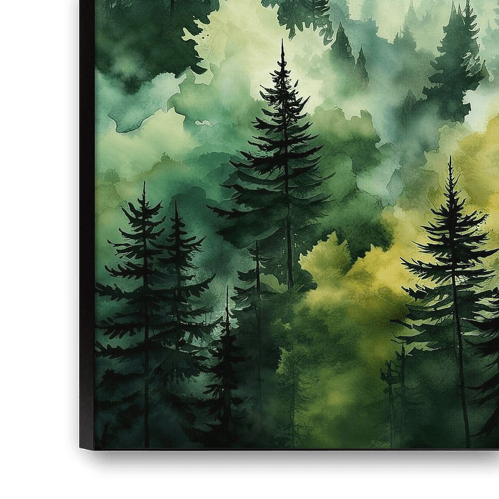 De gebruikte waterverftechniek versterkt het gevoel van diepte en ondoordringbaarheid, met verschillende tinten groen die overgaan in de mistige, haast etherische achtergrond. De dennenbomen staan fier en onbewogen, als stille wachters van het woud, terwijl de mist hen omhult en het landschap een dromerig karakter geeft. Dit kunstwerk nodigt uit tot contemplatie en biedt een ontsnapping naar een serene, bijna bovennatuurlijke wereld.