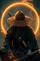 Elektriserend en goddelijk. Deze samoerai zit in een krachtige houding, omringd door een aureool van gouden bliksem en vonken. Het ingewikkelde detail van de strooien hoed en traditionele uitrusting in combinatie met mystieke energie creëert een aura van onstuitbare kracht.