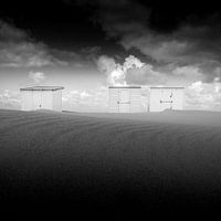 In zwart-wit toont dit beeld drie witte houten cabines, verspreid over het strand in een onregelmatig ritme. De horizon lijkt zich te vervagen, terwijl zand en lucht zich in een monochrome harmonie mengen. De afwezigheid van kleur legt de nadruk op de eenvoud en de stilte van het moment. De cabines staan er rustig, ongestoord door de tijd, elk afzonderlijk, maar toch deel van hetzelfde landschap. Het ritme van hun plaatsing creëert een gevoel van rust, terwijl de uitgestrektheid van het zand en de lucht eromheen het gevoel van vrijheid en ruimte versterken. De foto heeft een tijdloze kwaliteit, een herinnering aan de eenvoud van het leven aan zee. Het is een beeld dat niet alleen de omgeving vastlegt, maar ook de rust die het oproept. De stad en het dagelijks leven lijken ver weg in dit moment van stille schoonheid. Deze foto is een ode aan de natuur en de kracht van minimalisme, een perfecte toevoeging aan je interieur.