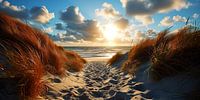 Het helmgras buigt sierlijk in de zeebries, en voetsporen tekenen het pad van eerdere wandelaars. De zee kabbelt rustig, reflecterend het warme zonlicht dat de wolken boven doorbreekt.