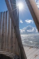 Dit beeld toont een detail van het kunstwerk De Streken, dat op zee is geplaatst en meebeweegt met eb en vloed. In deze foto ligt de nadruk op lijn, richting en licht: een uitsnede waarin de houten structuren het beeld openen naar zee en lucht.