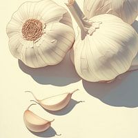De lichte achtergrond zorgt ervoor dat de details van de knoflookbollen opvallen, met name de complexiteit van de worteluiteinden en de subtiele kleurschakeringen van wit naar beige. Dit kunstwerk kan gezien worden als een viering van de alledaagse schoonheid die vaak over het hoofd gezien wordt, waarbij de kunstenaar het alledaagse object transformeert tot iets betoverends.