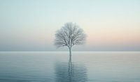 Het kunstwerk toont een eenzame, kale boom die oprijst uit een kalm wateroppervlak, zonder zichtbare oevers in de omgeving.