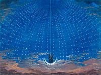 De Toverfluit Opera van Wolfgang Amadeus Mozart. Decorontwerp voor de tweede scène, de Sterrenzaal van de Koningin van de Nacht, Karl Friedrich Schinkel Dit is waarschijnlijk een van 's werelds beroemdste decorontwerpen, en tegelijkertijd een van de meest verbluffende visuele creaties van de 19e eeuw: Karl Friedrich Schinkels 'Sterrenzaal van de koningin van de nacht', die het decor vormde voor de tweede scène van de eerste akte van De Toverfluit van Wolfgang Amadeus Mozart (muziek) en Emanuel Schikaneder (libretto). Het werk heeft een betoverende kwaliteit, die voortkomt uit de duidelijke symmetrie, het contrast tussen de warme tinten die het beeld omlijsten en de overheersende koelte van het palet, de manier waarop de visuele ruimte een gevoel van hoog drama opbouwt dat doet denken aan barokke kunst, en de gedurfde herinterpretatie van twee beroemde onderwerpen uit de christelijke iconografie: de Regina Coeli als 'Madonna van de halve maan', de meesteres van de hemel die het kwaad overwint, en haar voorfiguur, de Vrouw van de Apocalyps, die een kroon van sterren draagt (zoals beschreven in Openbaring 12). In zijn thematisering van de dualiteit van natuur en architectuur, een terugkerend kenmerk in het werk van de kunstenaar, bereikt hij hier een mate van abstractie die zelden voorkomt in zijn andere werken. Enerzijds kan het tafereel worden opgevat als een stuk van de nachtelijke hemel, tegen de achtergrond waarvan we (in het onderste derde deel van het beeld en in de bovenste pendanten) duidelijke gradaties zien van natuurlijk verlichte, donkere wolkenformaties. Of het kan ook b