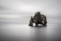 Op de dag dat deze foto werd gemaakt, leek het alsof die oude legende opnieuw ademhaalde. De lucht was grijs, de zee was grijs, en zelfs de verre bergen verborgen zich in de mist. In plaats van kleur te zoeken, koos ik ervoor het grijs te omarmen. Met een sluitertijd van negentig seconden werd de zee tot een vlakke plaat, glanzend als gestraald aluminium. Daarop stond Hvitserkur — stil, tijdloos en onverzettelijk, als een wezen dat nog altijd waakt over het noorden.