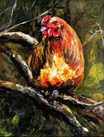 Hij zit op een tak in het bos, het zonlicht schijnt op zijn kleurrijke verenpracht en laat hem stralen. Hij kijkt rond van , zo mij kan niets gebeuren.