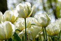 Meerdere witte tulpen gefotografeerd op de Keukenhof. Mooie bolletjes bokeh op de achtergrond en vanuit laag standpunt is de foto gemaakt. Sfeerfoto