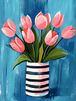 In dit kunstwerk wordt een bos tulpen in een vaas tot leven gebracht in een mix van kleurrijke kleuren en tinten, die prachtig samensmelten en een vrolijke sfeer oproepen.