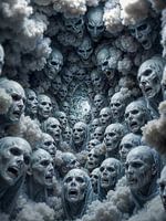 Dit indrukwekkende kunstwerk, getiteld "De Tunnel van Schaduwen," dompelt je onder in een surrealistisch en spookachtig tafereel. De afbeelding toont een claustrofobische, eindeloze tunnel gevuld met grimmige, vervormde gezichten die lijken te zweven in een atmosfeer van dreigende wolken. De sinistere schedelachtige gezichten, met hun lege ogen en gapende monden, stralen een duistere intensiteit uit die zowel fascinerend als verontrustend is. De lichte opening in de verte lijkt een ontsnappingsroute te bieden, maar versterkt tegelijkertijd de onheilspellende diepte van de compositie.