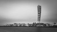Een 16:9 foto in Zwart-Wit van een avond na zonsondergang van de Turning Torso, een neo-futuristische woon-wolkenkrabber in de stad Malmö, aan de westkust van Zweden, en het hoogste gebouw in Scandinavië.