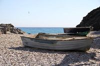 Twee boten die op het strand liggen met op de achtergrond de rotsen en de zee.