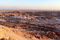 Het weidse landschap van de Valle de la Luna (Maanvallei) in Chile gehuld in gele, roze en bruine tinten tijdens zonsondergang.