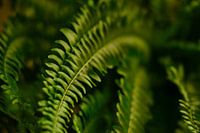 Een close up foto van een diepgroene varen, met sterke focus op één van de bladeren.
