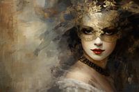 De Verborgen Blik - Met subtiele penseelstreken en een rijk palet van voornamelijk aardetinten, brengt dit schilderij een portret dat diepgang en mysterie uitstraalt. Een vrouw gemaskerd met bladgouden versieringen kijkt ons direct aan, waardoor je je direct afvraagt wat haar verbergt. De zachte overgangen en de ruimtelijke compositie…