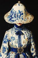 Een mysterieus en elegant kunstwerk waarin mode en traditie versmelten. De vrouw, wiens gezicht deels verborgen is onder een imposante lampvormige hoed met blauw-wit florale motieven, draagt een verfijnd gewaad dat doet denken aan Delfts blauw porselein. De diepe kleuren, het spel van licht en schaduw, en de luxueuze details zoals het fluwelen lint en de barokke gesp maken dit werk tot een visueel hoogtepunt. Ideaal voor wie houdt van stille luxe, geschiedenis en iconische vrouwelijke portretten.