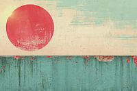 De cirkel lijkt een metaforische weergave van de zon of misschien een symbolische referentie naar de Japanse vlag, bekend om zijn eenvoudige rode 'hinomaru' op een witte achtergrond. De achtergrond, met zijn verweerde turquoise en crème tinten, contrasteert sterk met het rood van de cirkel en geeft het geheel een antieke uitstraling. Dit gevoel van ouderdom wordt verder versterkt door de afbladderende verf en de vlekken die over het gehele oppervlak verspreid zijn, suggererend dat het kunstwerk een lang verhaal vertelt en een rijke geschiedenis bezit. De zichtbare houtnerf en de kieren tussen de planken geven het werk een textuur die tastbaar lijkt en nodigen uit om de oppervlakte te voelen.