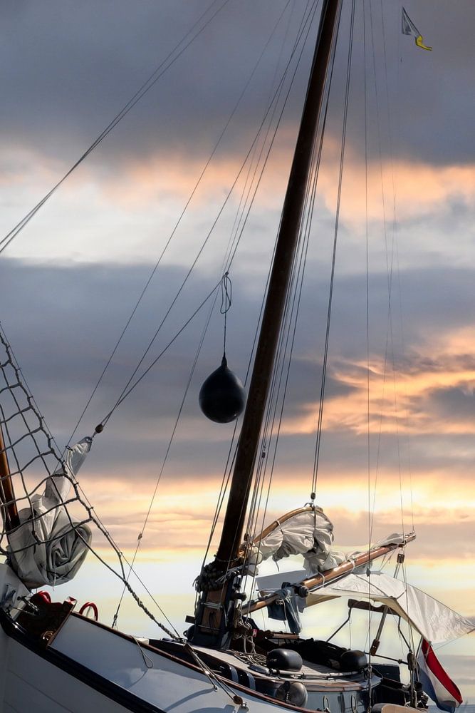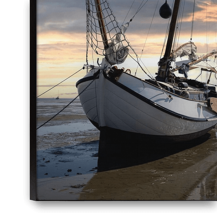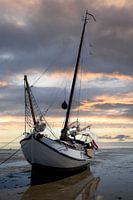 Een platbodem die drooggevallen op de Wadden rust, gevangen in het magische moment van zonsondergang. De lucht kleurt zacht van warm goud naar zacht oranje, terwijl het laatste licht van de dag weerspiegelt in het natte wad. De stilte is bijna tastbaar.