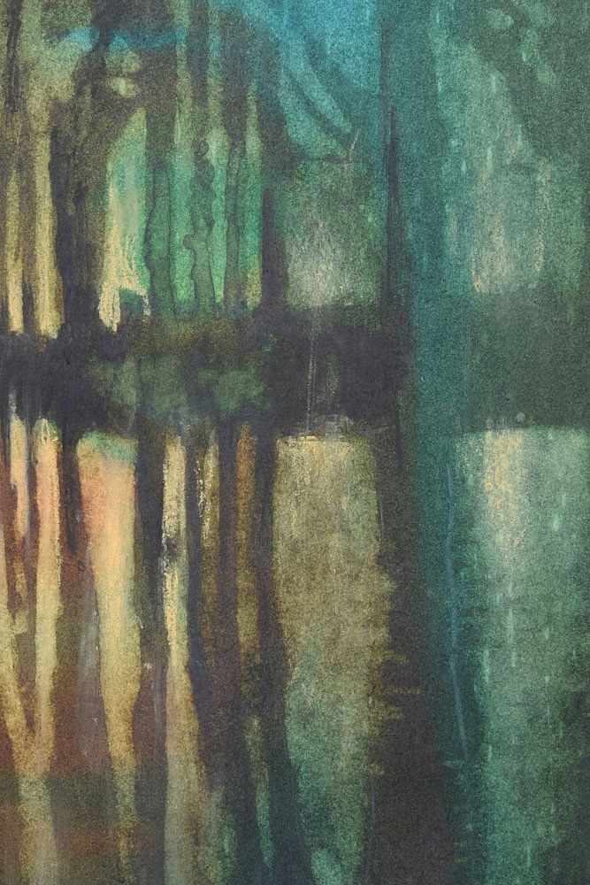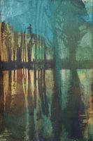 Aquarel van de vijver achter ons huis in het gefilterde avondlicht