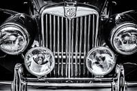 Zwartwit closeup van de voorzijde van een klassieke MG sportwagen