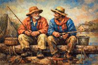 Op een eenvoudige bank aan het water zitten twee vissers naast elkaar. De hengels in de hand, de tijd even stil. In warme, gelaagde penseelstreken vertelt dit werk over gedeelde momenten, zwijgende gesprekken en het doorgeven van ervaring. De Vissersbank is geen plek, maar een staat van zijn: waar rust, herinnering en verbondenheid…