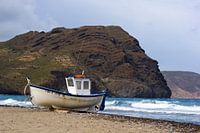 Een vissersboot dat op het strand getrooken is, met op de achtergrond een grote rots.