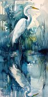 Op dit rustgevende, vredige aquarelschilderij is een grote reiger afgebeeld, statig poserend aan de rand van een vredig meer.