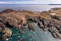 De markante vuurtoren van Cape Bonavista staat op het eind van een schiereiland op een rotsachtige omgeving. Vanuit de lucht zijn de vormen van het landschap en de vuurtoren goed te zien.