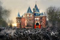 Een sfeervol bewerkte impressie van de Waag in Amsterdam, vastgelegd aan het einde van een novembermiddag wanneer het licht door de ondergaande zon zacht begint weg te glijden. De contouren van het historische gebouw blijven stevig overeind, terwijl de omgeving juist vervaagt tot een mix van silhouetten en beweging. De drukte van de…