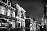 De Waag, in de Benschopperstraat in IJsselstein, stamt uit 1779. Het weeggedeelte van de Waag is nog altijd helemaal intact. Het grote gedeelte kan naar buiten worden uitgeschoven. Op de locatie van De Waag stond ook al eerder een waag. Een gedenksteen uit 1599 herinnert daar nog aan. Deze foto is de zwartwit uitvoering van een avondopname. Er is ook een kleuren uitvoering van dezelfde foto. Zie elders in dit album.