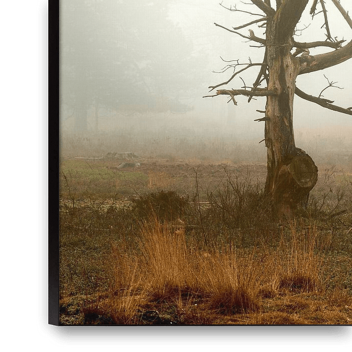 Een dode boom op de Noorderheide bij Vierhouten. De boom heeft een prachtig karakteristiek skelet dat opvalt in de leegte van de heide, dat wordt versterkt door de mist op de dag dat de foto werd gemaakt.