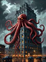 Op een sombere, regenachtige dag, te midden van de grijze wolken en de druppels die onophoudelijk neerstorten, zit een kolossaal krakenmonster bovenop een hoog gebouw. Dit surrealistische kunstwerk vangt een moment waarin het bovennatuurlijke samenkomt met het alledaagse, waardoor een fascinerend en mysterieus tafereel ontstaat. Het krakenmonster, met zijn gigantische tentakels die zich uitspreiden als donkere schaduwen over het gebouw, lijkt de stad beneden in de gaten te houden, als een oude bewaker van vergeten geheimen.