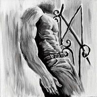 Een sterke gespierde man leunt tegen een muur naast de sierlijke smeedijzeren poort. Zijn fysieke kracht en zelfvertrouwen worden benadrukt door de contrasterende zwart wit en grijze verf stroken. De schaduwen en lichtinval benadrukken zijn spieren terwijl de kalme grijs tinten de nonchalante sfeer versterken.