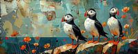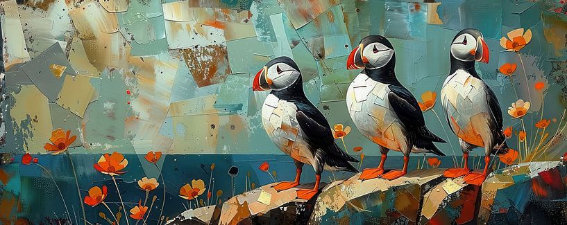 Hun oranje snavels en felgekleurde poten contrasteren scherp met hun zwart-witte verenkleed. De achtergrond is abstract en opgebouwd uit blokachtige vormen in zachte blauwen en groenen, wat de zee en de lucht suggereert. Aan hun…