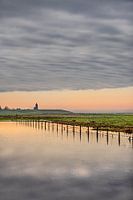 Met het bij eb droogvallende deel bij de Friese Waddendijk op de voorgrond en het kerkje van Wierum achter de dijk duidelijk zichtbaar op een windstille zomerdag met een langzaam opschuivend wolkendek tijdens zonsondergang.