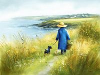 Zacht en sfeervol aquarel-kunstwerk van een vrouw in blauwe jas en hoed die samen met haar kleine teckel over een bloemrijk klifpad naar de zee loopt, ideaal als warme en nostalgische wanddecoratie.