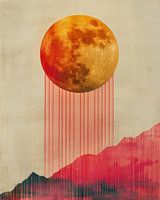 Dit vrolijke, trendy kunstwerk is een abstracte weergave van een landschap onder een dominante hemellichaam, vermoedelijk de zon, met een diepe oranje en gouden tint die een intense en levendige gloed uitstraalt.