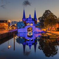 Een vierkante foto van een zomeravond in Sneek bij de Sneeker Waterpoort die blauw wordt opgelicht.