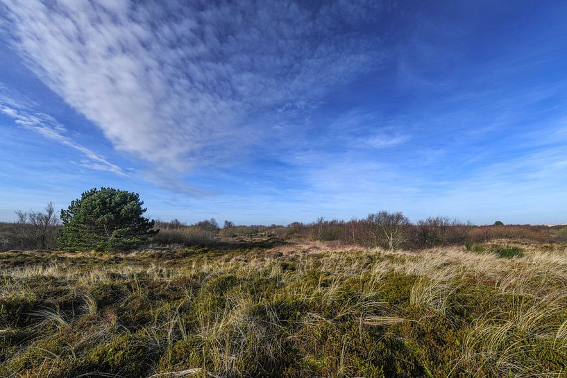 Deze panoramische opname biedt een blik op het Groene Strand van Terschelling, een dynamisch natuurgebied waar het wad en de duinen elkaar ontmoeten. De solitaire den aan de horizon getuigt van de overlevingskracht in dit zilte landschap, terwijl de wolkenlucht de weidse vrijheid van de Waddeneilanden benadrukt. Biologisch gezien is het…
